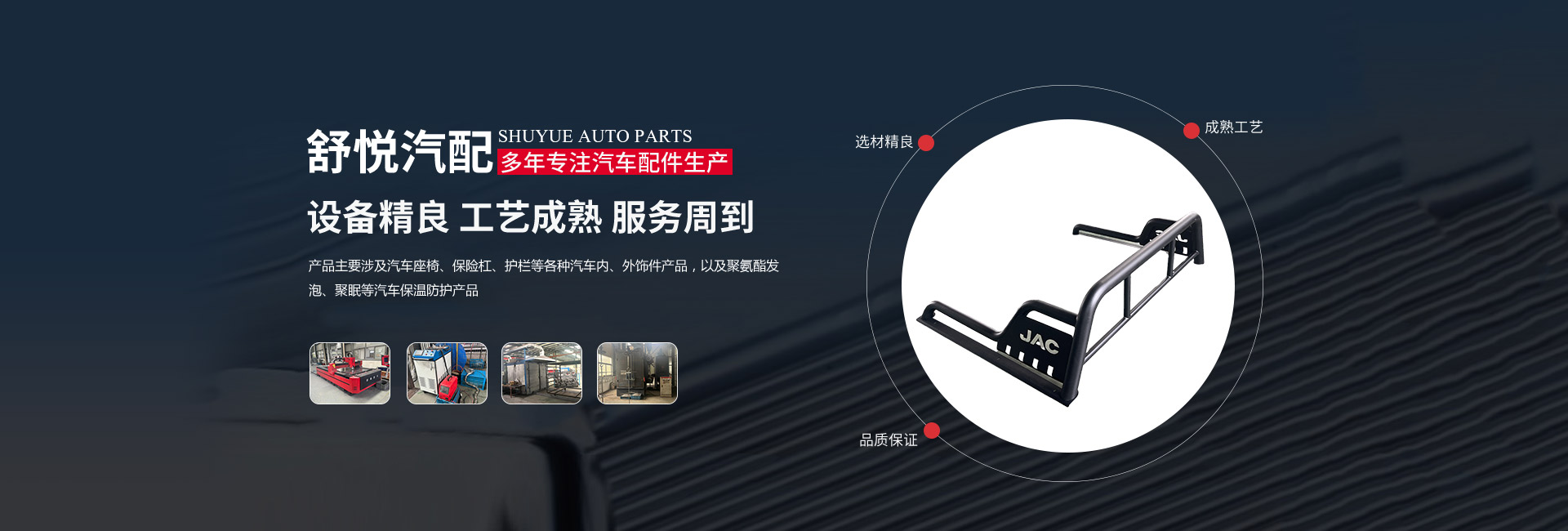 揚州舒悅汽配有限公司經過多年的穩定發展,業績一直蒸蒸日上。公司產品主要涉及汽車座椅、保險杠、護欄等各種汽車內、外飾件產品,以及聚氨酯發泡、聚脲等汽車保溫防護產品。其主要是為江淮、金龍,奇瑞等公司服務,已連續多年成為江淮、金龍等公司的A級供應商。        公司成立于1997年,現坐落于揚州市儀征劉集盤古工業集中區202號,公司占地面積26640平 方米,廠房建筑面積18512平方米。公司擁有先進的制造設備、可靠的生產工藝、完善的檢測手段和科學的管理,在售前和售后服務中做到快速反應,應急應變,為客戶提供優良產品和滿意服務。公司的產品開發能力和生產規模在同行業中處于前列的地位。        揚州舒悅人秉承“誠信雙嬴”的原則,發揚“誠信、務實、創新、貢獻”的企業精神,恪守“顧客至上”的經營宗旨,致精從業,不斷引進新技術、新材料。以優良的產品、合理的價格和周到的服務參與市場競爭。公司愿與國內外朋友建立真誠的合作伙伴關系,攜手共創輝煌!
